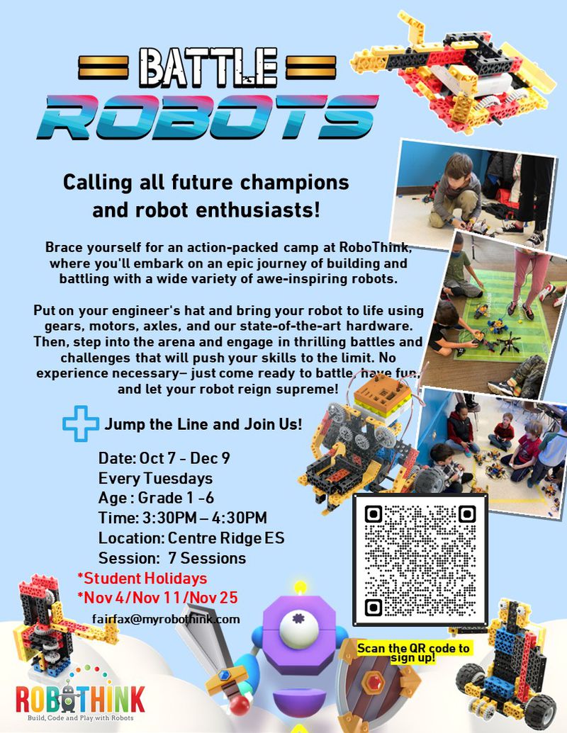Calling all future champions and robot enthusiasts! Brace yourself for an action-packed after-school at RoboThink, where you'll embark on an epic journey of building and battling with a wide variety of awe-inspiring robots. Put on your engineer's hat and bring your robot to life using gears, motors, axles, and our state-of-the-art hardware. Then, step into the arena and engage in thrilling battles and challenges that will push your skills to the limit. No experience necessary– just come ready to battle, have fun, and let your robot reign supreme!